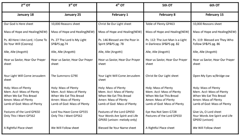 Sunday Mass Music List